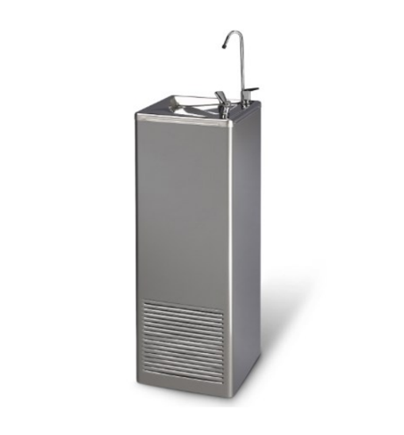 Stainless steel drinking fountain, providing chilled, filtered water in indoor spaces.